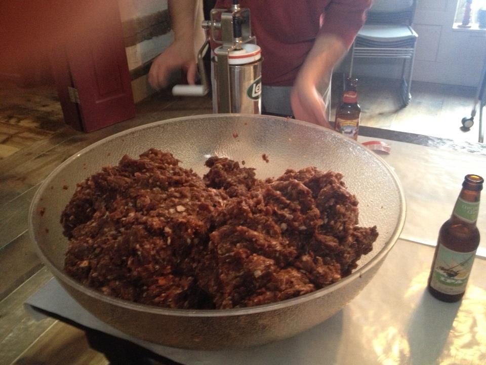 This picture shows a 50 pound bowl o’ meat! The device on the right is a meat mixer. You can just use your hands though. Even better option is to use someone else’s hands because the meat needs to stay very cold (gets just a little painful) through the whole process to keep the fat from running.