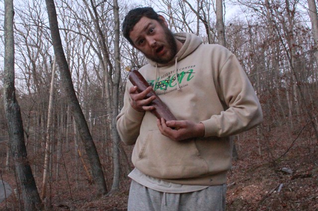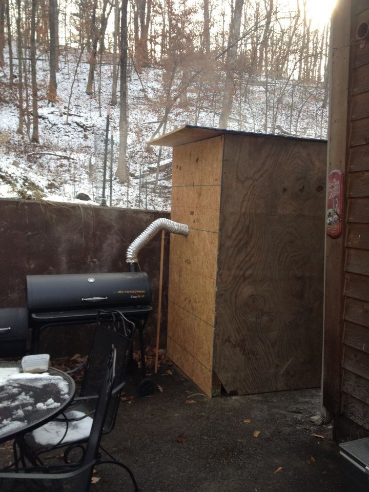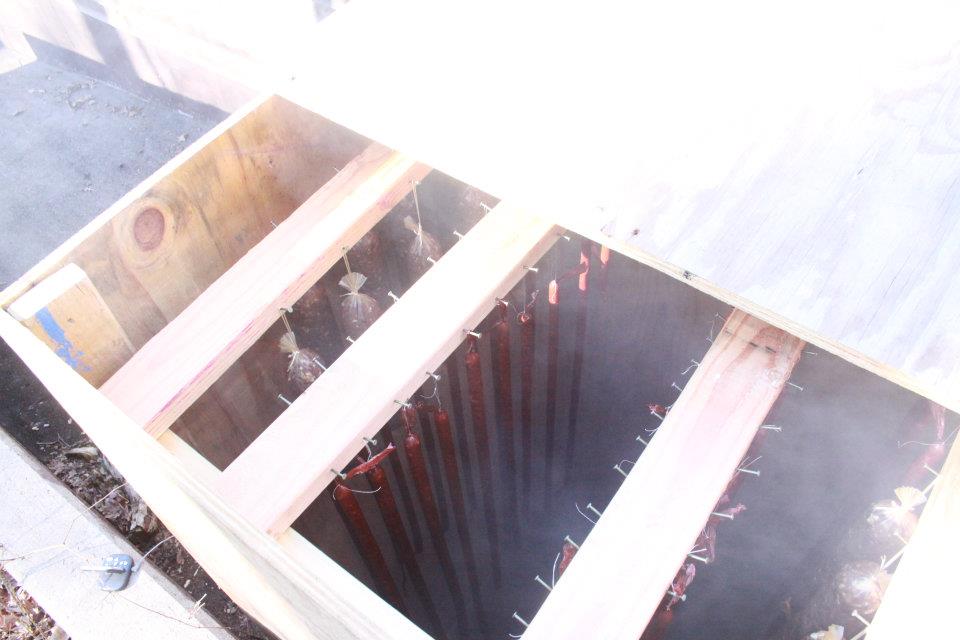Then it is time to cold smoke it!!! (assuming you are making a smoked style salami) We just build a box out of plywood and attach 2×4’s to the top to rest the other wood that the meat hangs from. Then, we put another piece of plywood on the top. It sounds like a great deal of work, but it’s not at all. Take you 15 minutes.