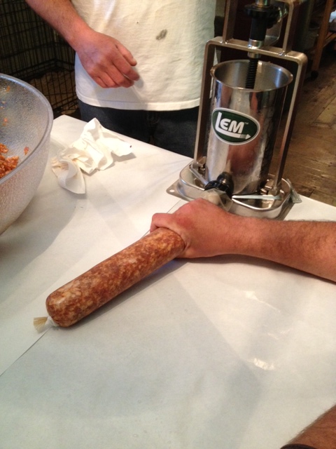 Once everything is stuffed, find some sucker…I mean helper, to go through with a CLEAN pin (heat to sterilize) and poke any large air bubbles that are visible inside the casings. As you get better working with your stuffer you can minimize these, but expect them to exist as your are learning.