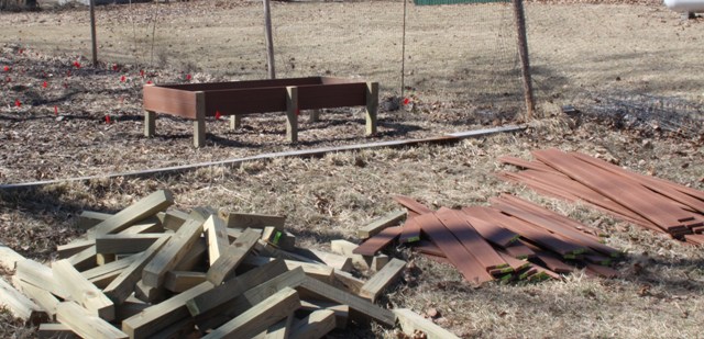 You can get around this using stone or brick, but that’s heavy and requires concrete of some sort to glue it all together. What I use is composite decking. It is 90% plastic and 10% wood fiber, typically. “Oh but plastic is bad,” you might say. It’s all cool, this is almost entirely recycled plastic. Turns out, the easiest things to do with plastic is melt it down into a lump, which is essentially what this decking is. Once melted, it’s all inert so nothing is going into your garden soil.