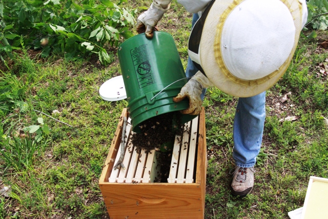 Now, bees don’t want to live in that bucket. We’re not talking about lightening bugs or caterpillars here. When capturing a swarm, its important to have a deep hive body on hand. Once you are confident you got the queen, just dump the bucket ‘o bees into the hive body.