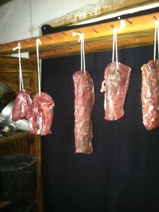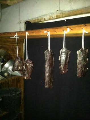 Now we enter the phase of trying not to go look at it all the time!  It’s the hardest part. These will need to hang for a month or so in the conditions of my basement.  55% percent humidity and 50 degrees.  Since it’s cold down there now, mold won’t grow, but when I do this in the summer the Ssourah gets a thick coating of white mold.  Perfectly safe, perfectly harmless, nothing to worry about.