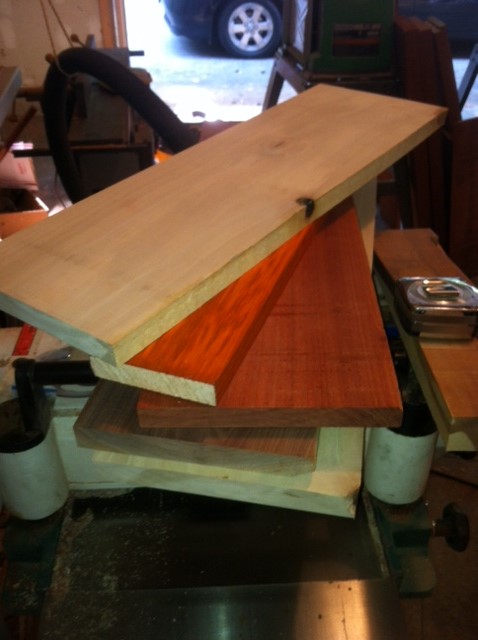 Then I run those boards through my planer to get them all to the same thickness.  FunFact…bloodwood is super hard so the planer is deafening when you run it through.