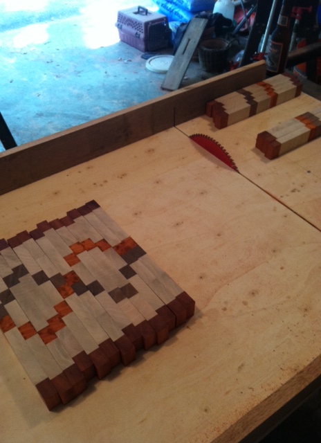 With all three boards cut to the same width, all we have to do is flip them onto the end-grain and start assembling the pattern.