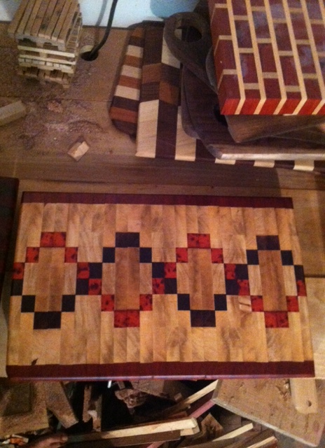 I thought some folks might want to see the steps I go through in making one of those fancy cutting boards, so I took some photos while I was making one.  You have to guess at the design as we go along….
