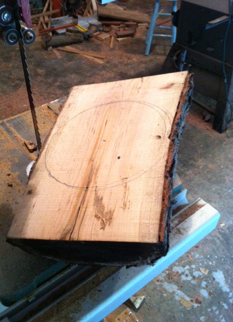 Once cut in half, I drew out a circle and then cut that out.  This allows the pith to run from side to side of the bowl instead of plunging my gouges into end-grain.